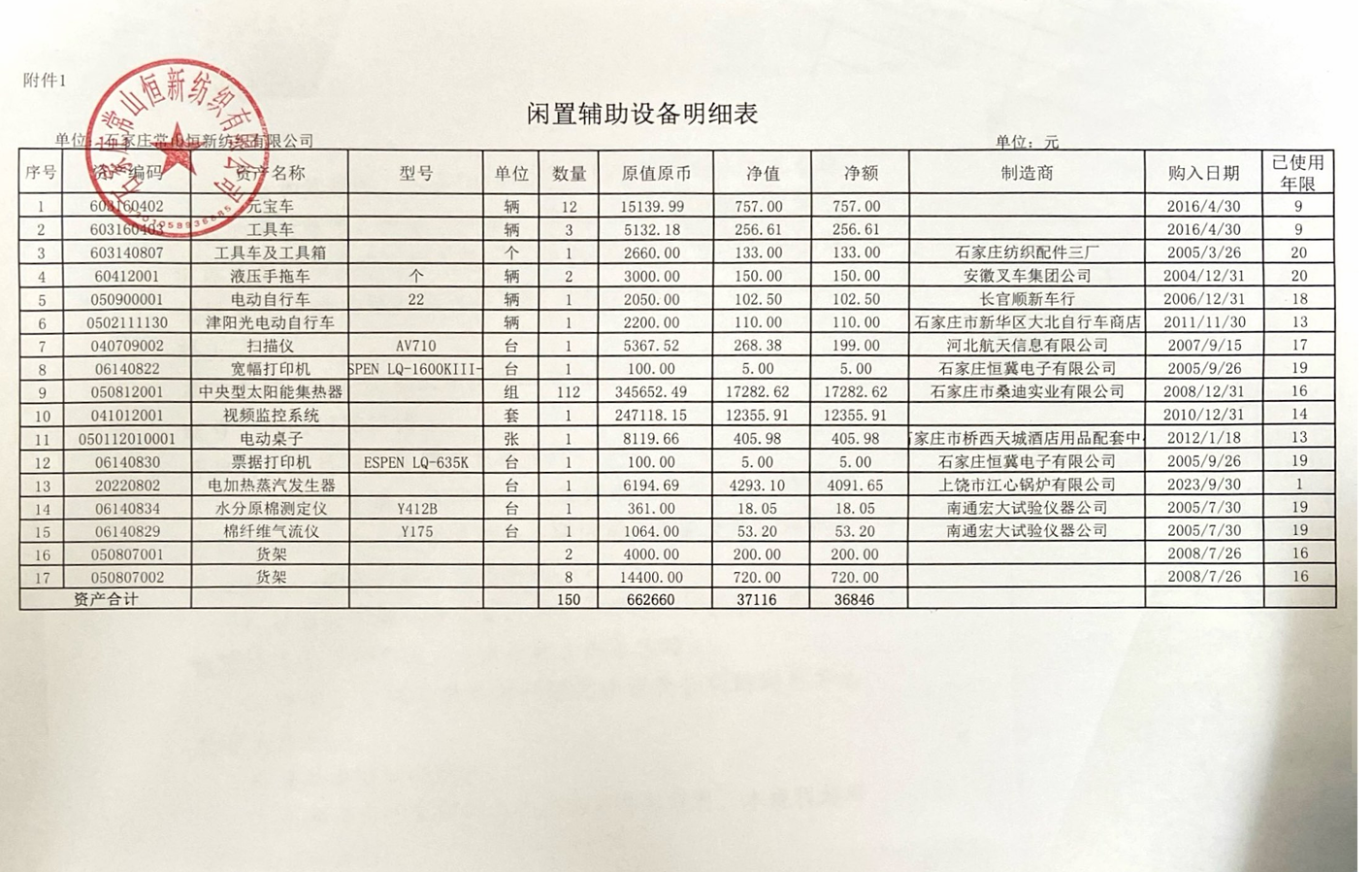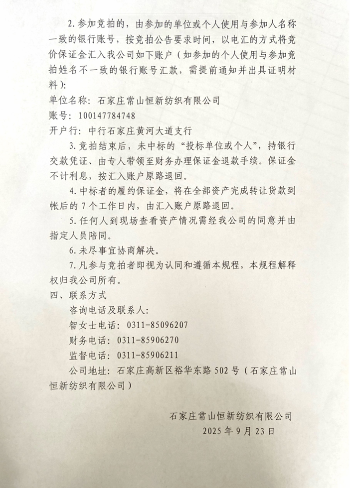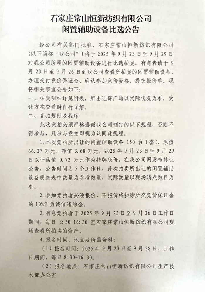 石家莊常山恒新紡織有限公司閑置輔助設備比選公告